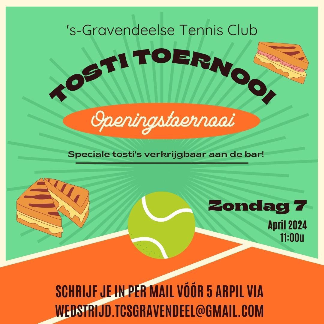 Zondag 7 april openen we het tennisseizoen weer! 🎾🎾 Ook dit jaar doen we dit weer met een leuk, gezellig en sportief openingstoernooi! Hierbij wordt je ingedeeld in teams en speelt gedurende dag gemengd tegen elkaar. Met als leuke extra deze dag, heerlijke speciale tosti’s die aan de bar te bestellen zijn!😋